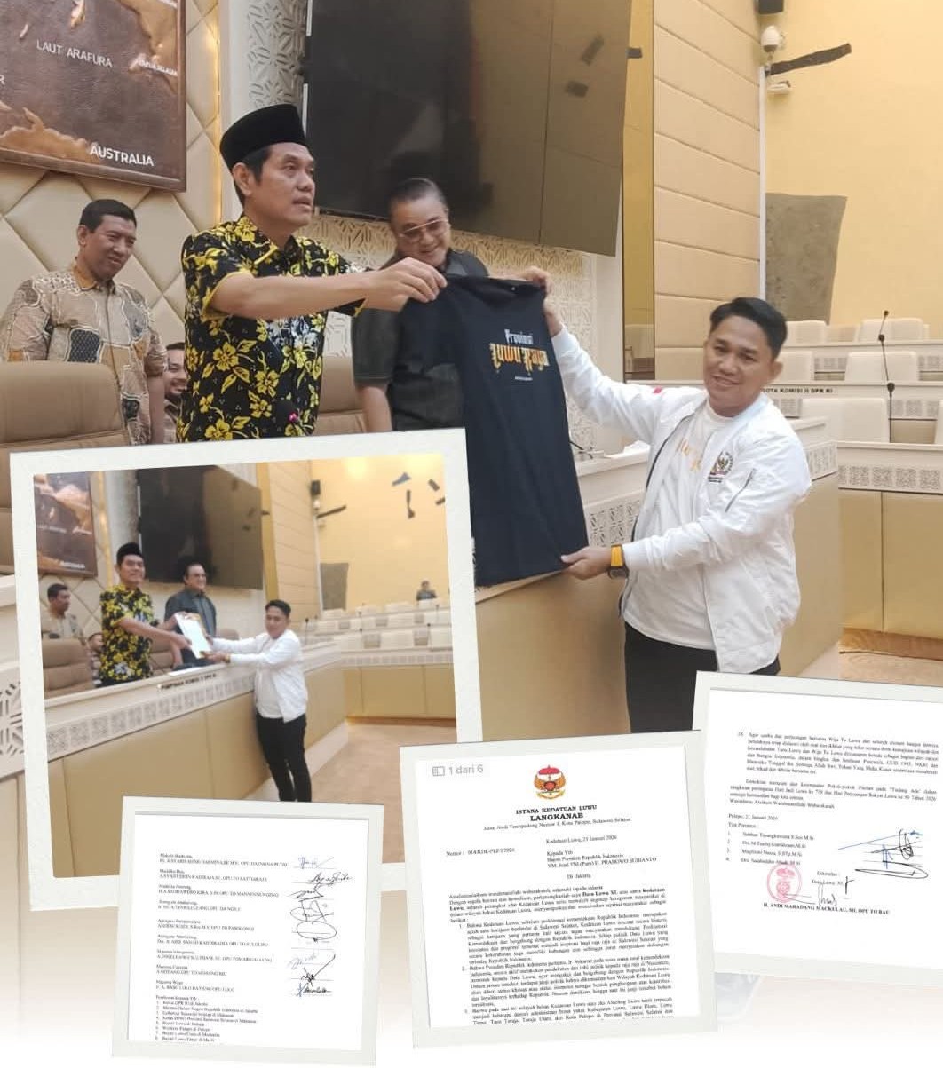 LUTRA.SINYALTAJAM.COM -Ketua DPRD Luwu Utara, Husain, menyerahkan secara langsung tembusan surat Kedatuan Luwu terkait kehendak rakyat Tana Luwu untuk pembentukan Daerah Otonomi Baru (DOB) Provinsi Luwu Raya kepada Komisi II DPR RI, di Ruang Rapat Komisi II DPR RI, pada Rabu (11/02/2026).
