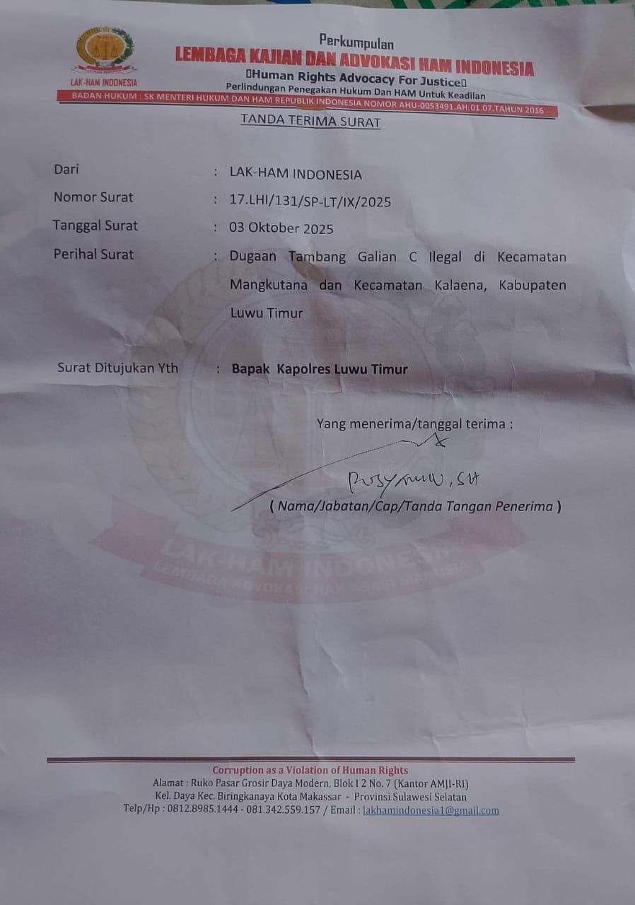Laporan kedua datang dari Lembaga Lak HAM Indonesia (LHI) melalui Ketua Kalakhar Iskaruddin, yang secara resmi melaporkan dugaan aktivitas tambang galian C ilegal di sepanjang Sungai Kalaena, Kecamatan Mangkutana dan Kalaena.