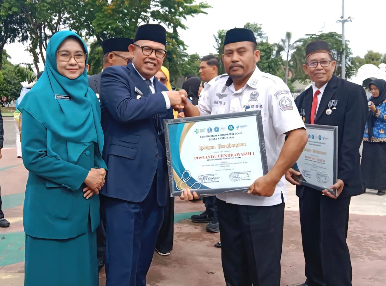 Wakil Bupati Bone Dr. H. Andi Akmal Pasluddin, SP., MM didampingi Wakil Ketua TP PKK Bone Hj. Maya Damayanti A. Akmal menyerahkan penghargaan tersebut kepada Kades Libureng, Jumtu Alam pada peringatan Hari Kesehatan Nasional ke-61 tahun 2025 di lapangan Merdeka Watampone, Rabu (26/11/25).