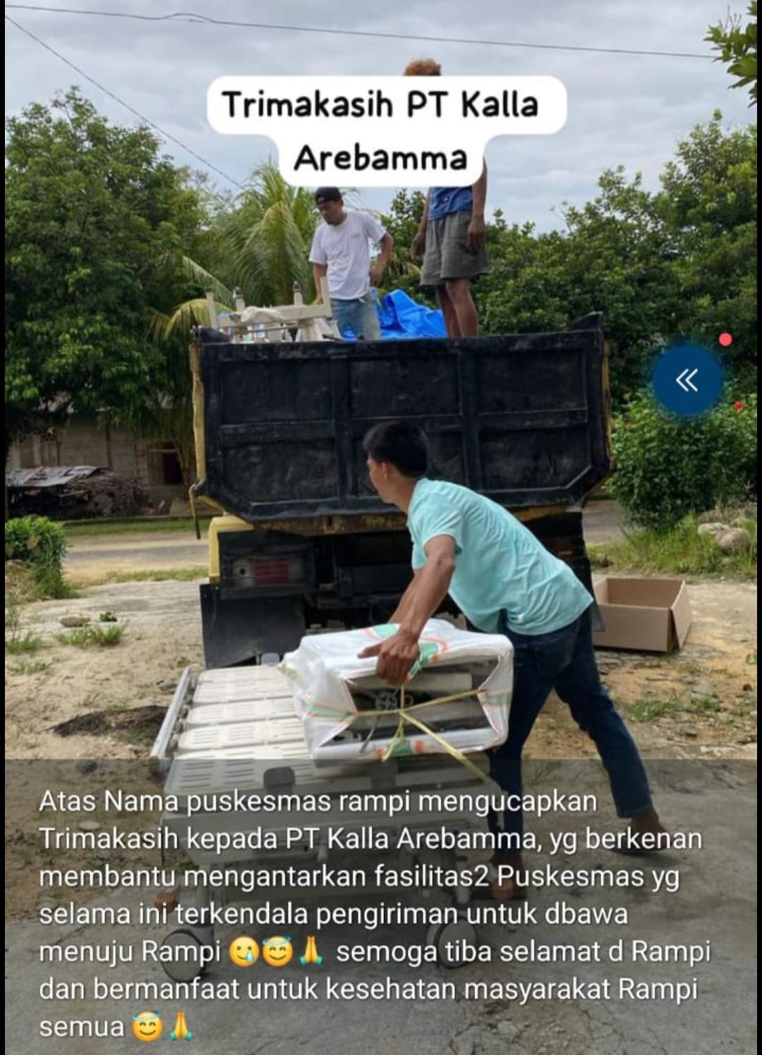 Setelah mendapat kepastian, dr. Nelvi menyampaikan apresiasi melalui unggahan WhatsApp. “Atas nama Puskesmas Rampi, dan sekaligus masyarakat,kami menyampaikan terima kasih kepada Direktur utama PT Kalla Arebamma yang bersedia membantu pengiriman fasilitas kesehatan Rampi. kiranya bermanfaat bagi masyarakat,” tulisnya.