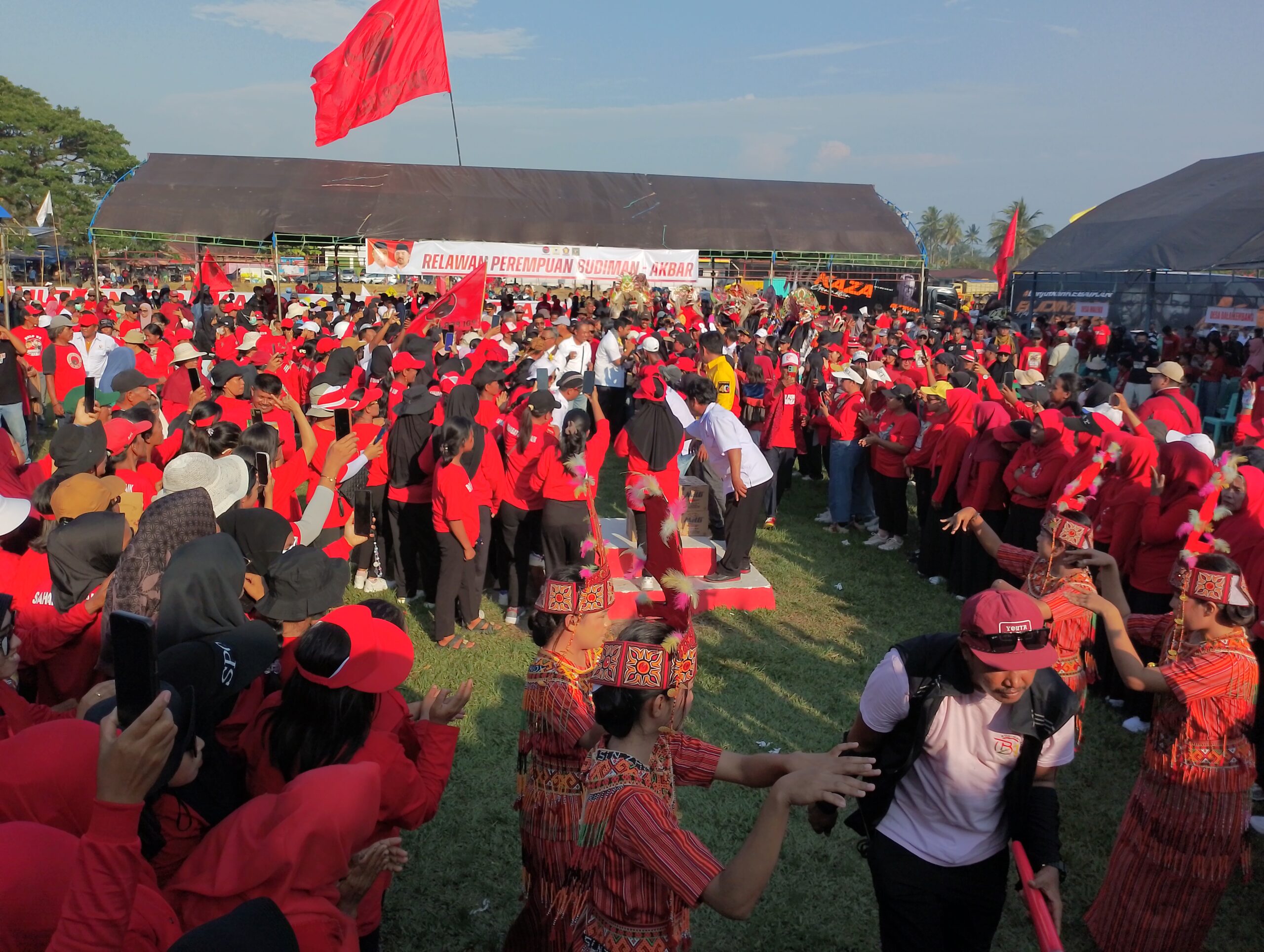 “Pergi Berlayar Naik Sampan, Sambil Makan Kuetan Jika ingin Maju dan Menang Jangan Lupa Pilih Budiman -Akbar,” Tim Kartini Leontin Dewi Susanti berpantun, disambut tepuk tangan ribuan Massa.