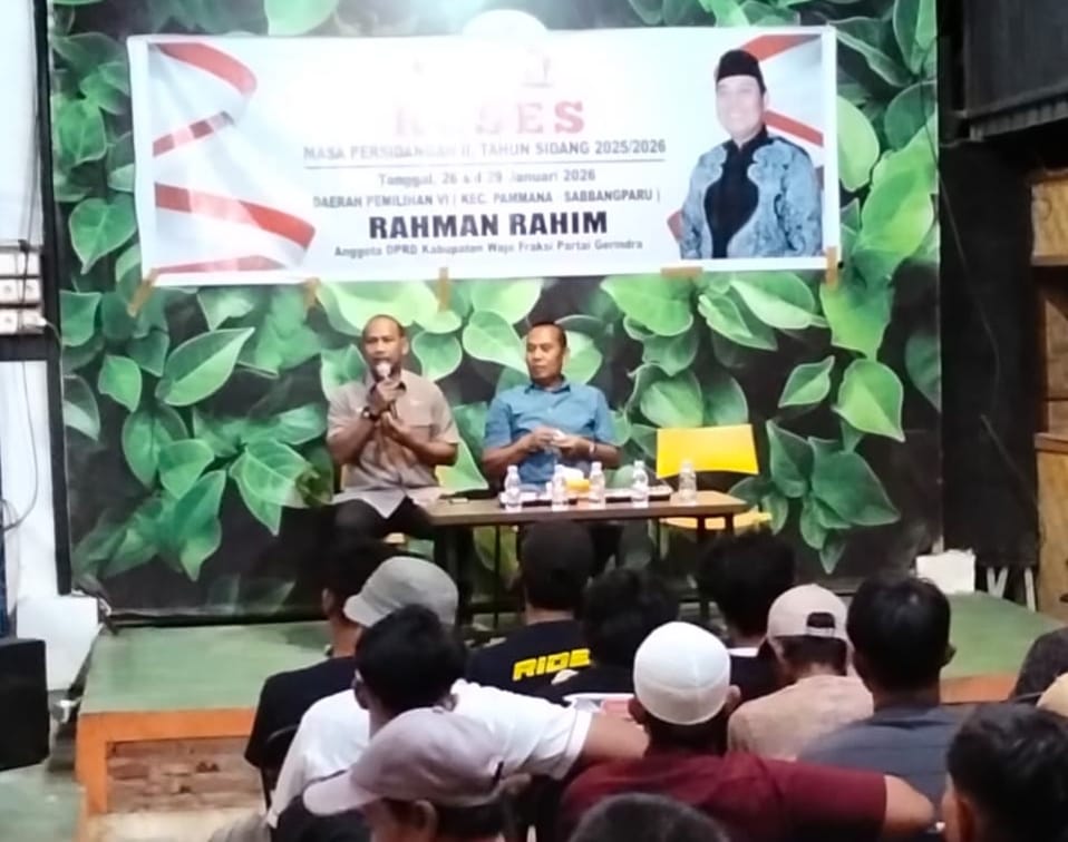 WAJO.SINYALTAJAM.COM — Anggota DPRD Kabupaten Wajo, Rahman Rahim, SE, kembali menyerap aspirasi masyarakat melalui kegiatan reses titik kedua yang digelar di Takoba, Kecamatan Sabbangparu. Berbeda dengan reses sebelumnya, kegiatan kali ini secara khusus menitikberatkan pada pemberdayaan sumber daya manusia (SDM), terutama bagi kalangan pemuda.