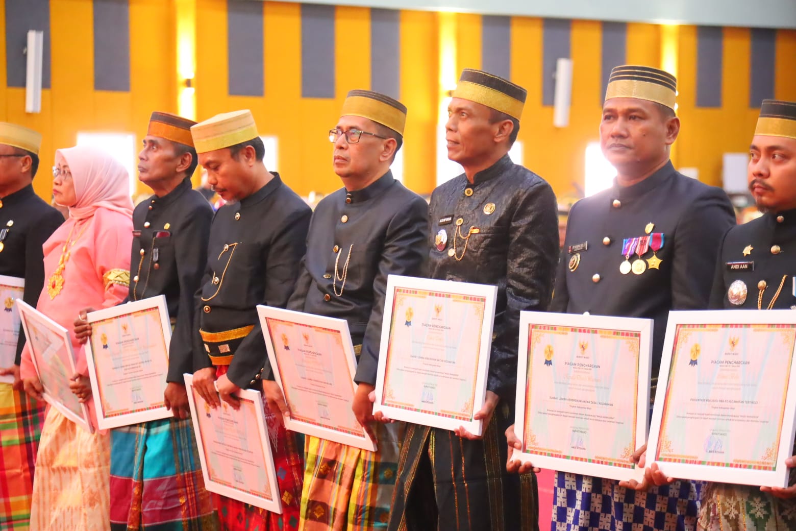Mengenakan pakaian adat Bugis lengkap — jas tutup berwarna gelap, songkok Recca, dan lipa’ sabbe bermotif warna-warni — para pejabat tampil membanggakan saat menerima piagam penghargaan berbingkai putih di hadapan hadirin.