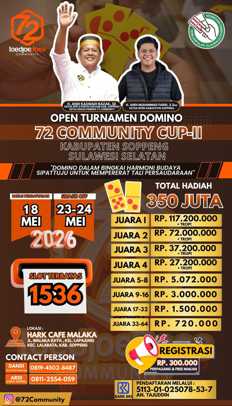 SOPPENG.SINYALTAJAM.COM – Atmosfer kompetisi domino di Kabupaten Soppeng dipastikan bakal semakin semarak. Turnamen bergengsi bertajuk 72 Community Cup II resmi dibuka untuk umum dan siap menghadirkan ratusan peserta dari berbagai daerah.